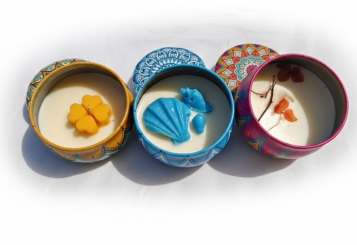 These themed tin candles come in colourful printed metal jars with unique wax toppers like butterflies, shells and leaves, making them look stylish and festive.
